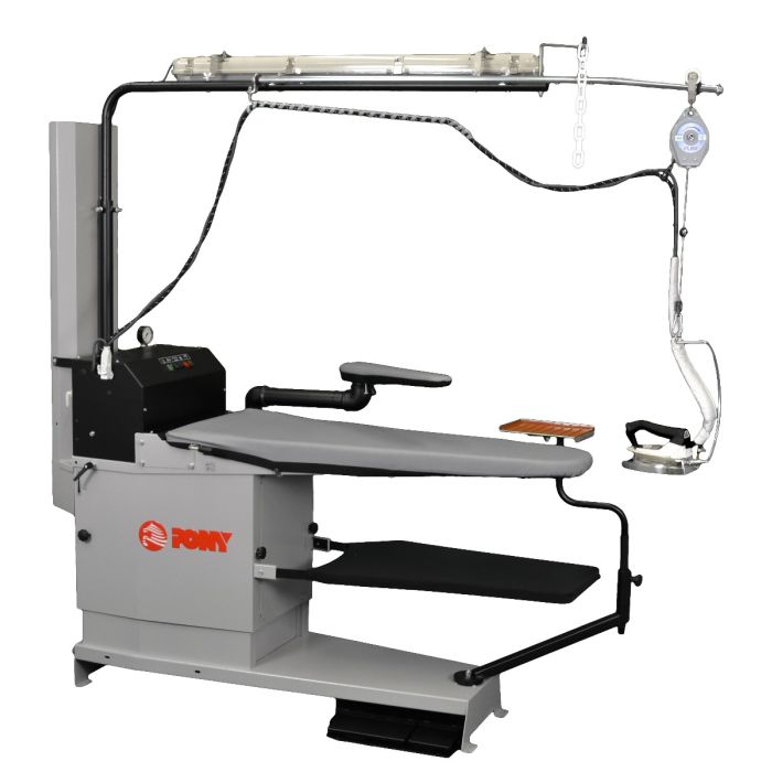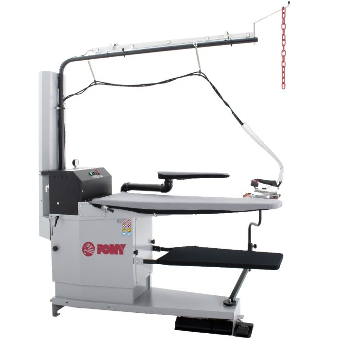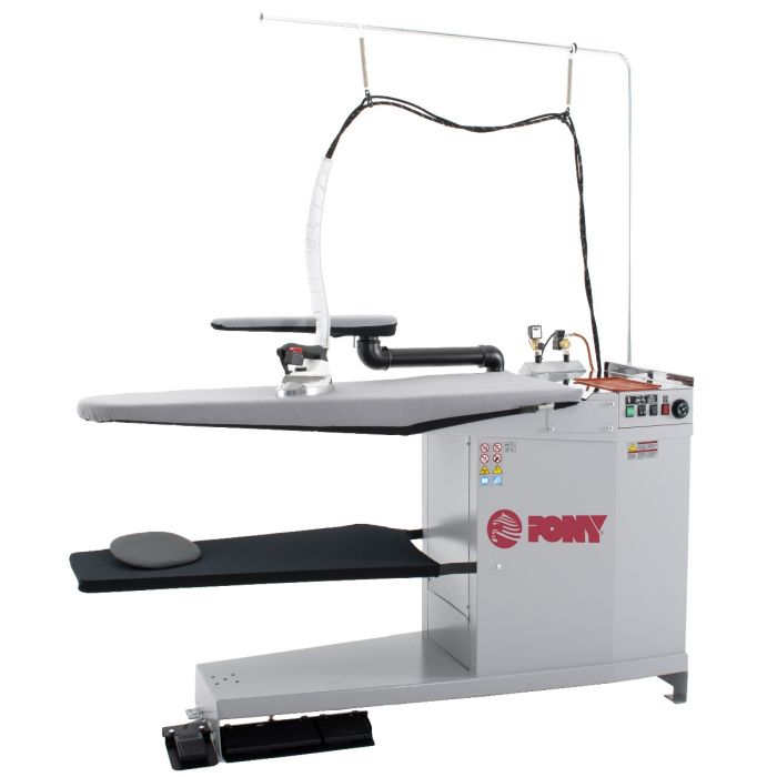Genus ironing tables are electrically heated and display innovative aesthetic and construction features, greatly meeting expectations in terms of quality, competitiveness and reduction in consumption. Their large board (1300 x 500 mm, small end 250 mm), combined with air-blowing, makes finishing operations easier and faster, especially on trousers. Outstanding vacuum function thanks to the powerful THREE-PHASE vacuum unit. The board is ready to fit 2 arms with shapes and can be equipped with features that allow operations on either sides. Switch to invert pedal control of vacuum and air-blowing. Separate pedal for steam activation.